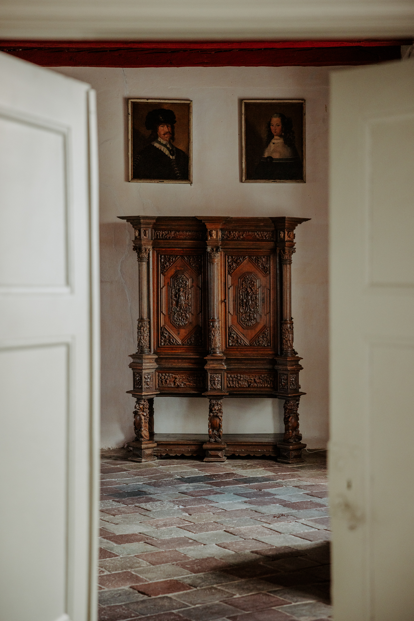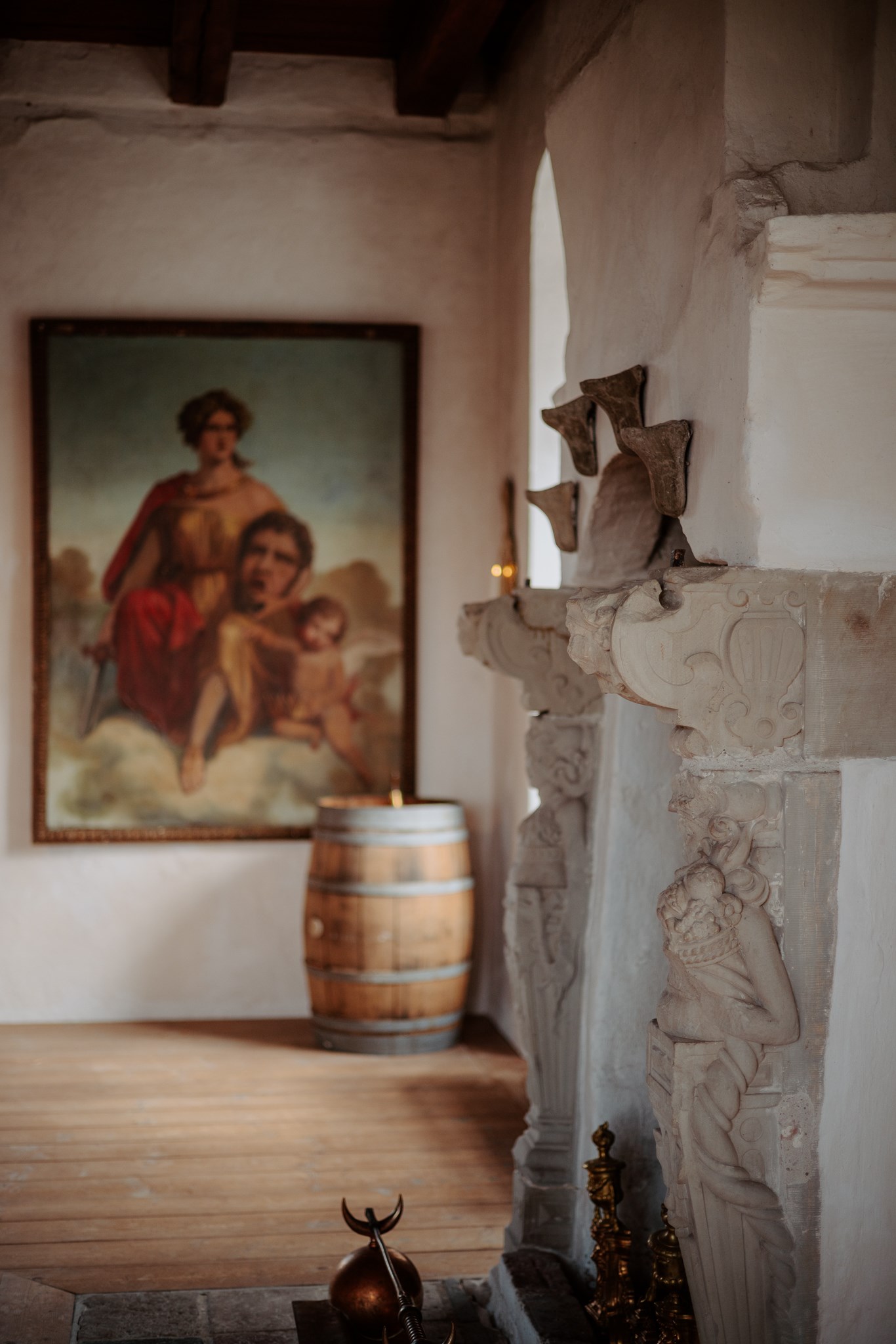 Et fantastisk rum, der gennem tiden har været, og fortsat er, ideelt til mindre selskaber. De gamle lædermøbler, store skabe med fine udskæringer og den stemningsfulde kamin, nænsomt renoveret i 1986, med sandstensornamenter skaber en særlig atmosfære.På den tunge træbjælke over kaminen har Nationalmuseet foretaget prøveafdækning af malingslagene, og man aner et kunstfærdigt mønster. Til højre for kaminen hænger to portrætter af Prins Christian (søn af Christian 4.) og hans gemalinde prinsesse Magdalena Sibylla. Et diskret nik til fortiden, der minder os om rummets og stedets historie.