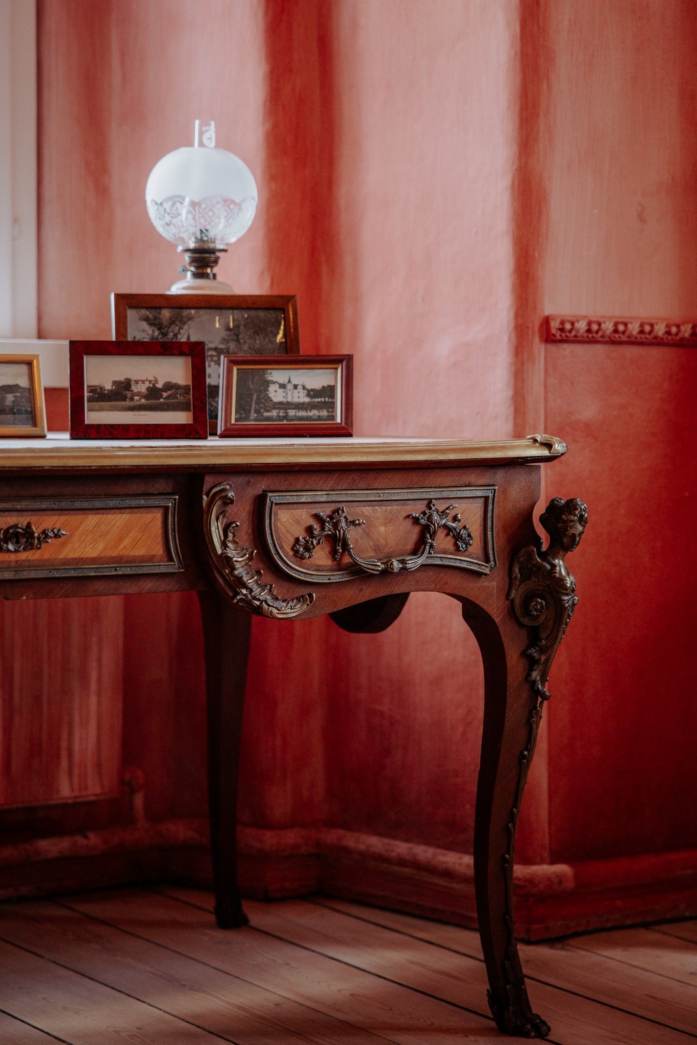 I Den Røde Stue, hvor velourtapet står i smuk kontrast til det hvælvede stukloft kaldes tidligere for Fruestuen, hvor bl.a. Anne Lykke og kammerpige opholdt sig med deres baldyrerammer. Østre væg har tidligere indeholdt en dobbeltdør til skabet i Te-salonen, hvori der var en lem i gulvet, som første direkte ned i ”fangekælderen” og løngangen ad en hemmelig vindeltrappe.
