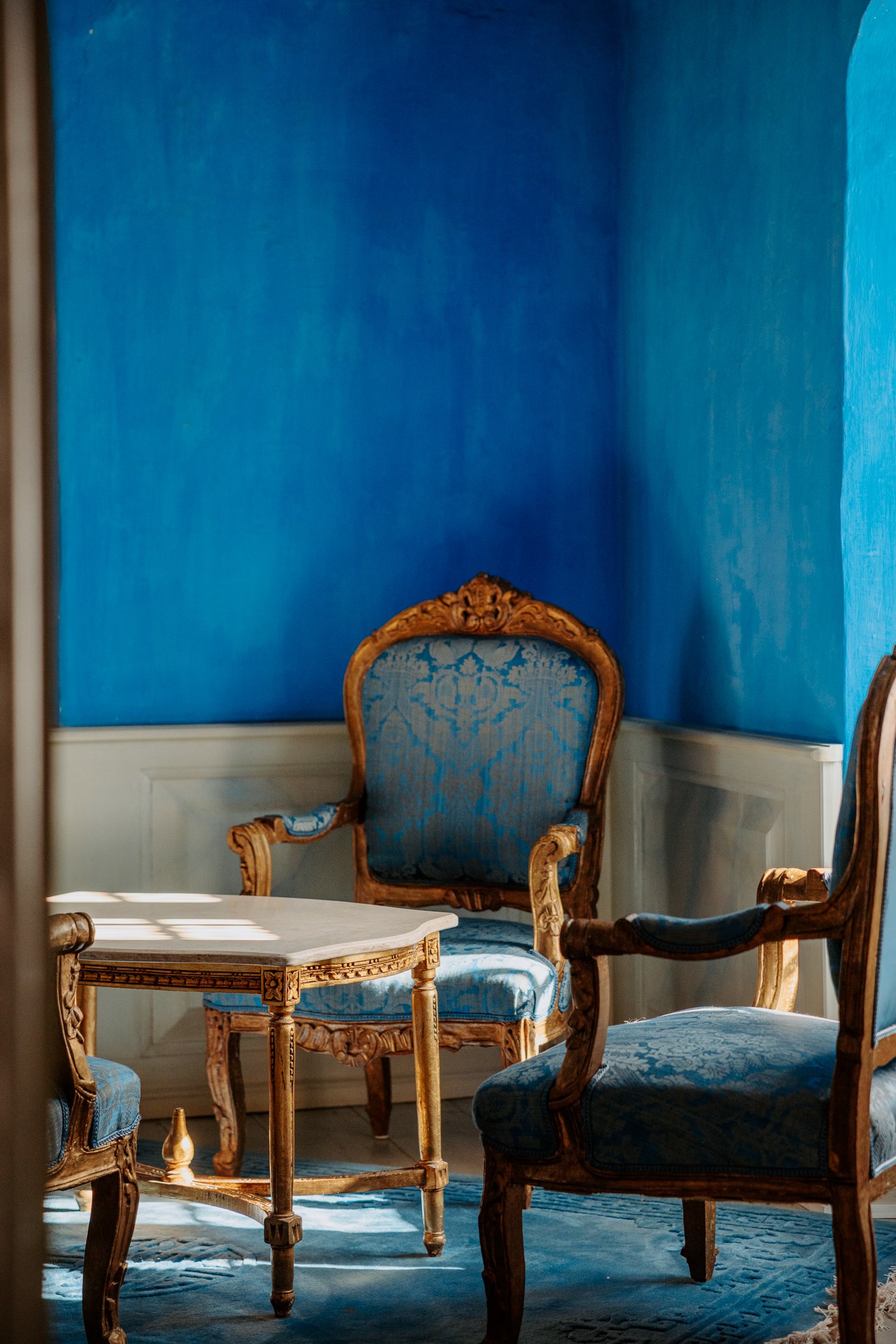 Dette charmerende værelse med sine blåmalede vægge er restaureret i 1998, og er udstyret med smukke håndskårne paneler fra 1600-tallet, som er blevet bemalet (marmoreret) af en konservator. Rummet, som befinder sig i samme niveau som Riddersalen, blev tidligere anvendt som hvilested for trætte riddere, som havde fået for meget vin og fynsk øl.